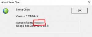 Please start Sierra Chart. Look for the Help item on the right in the top menu and then the About item on the bottom of the drop down menu. Or simply press Alt+L then A. There you will see the Account Name field in the middle.